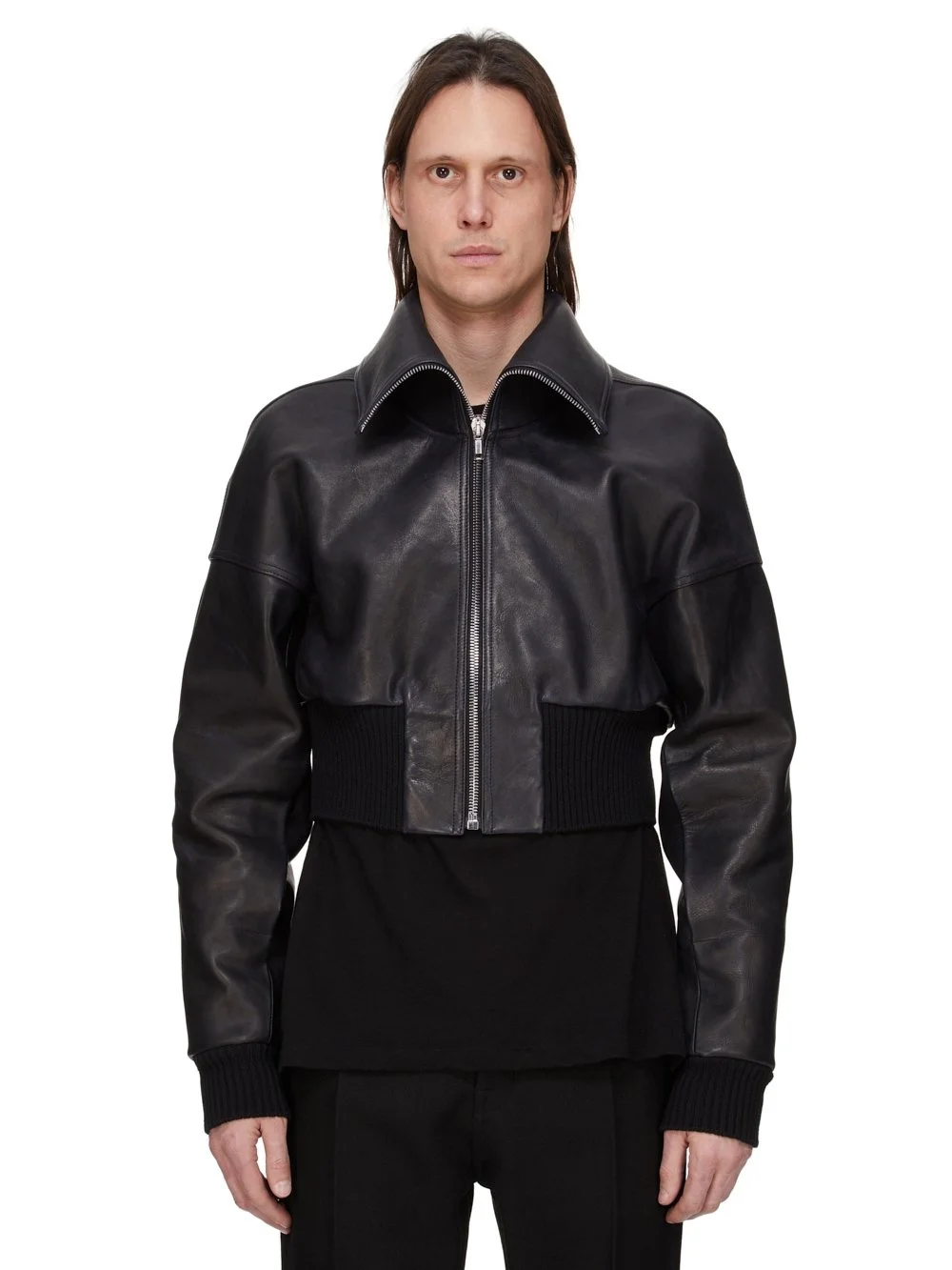 RICK OWENS FW25 CONCORDIANS RUNWAY DRACUCOLLAR JKT IN BLACK WASHED CALF LEATHER THIS DRACUCOLLAR JKT IS WAIST LENGTH WITH LONG SLEEVES AND A DROPPED SHOULDER. IT HAS A CENTRE FRONT ZIPPER CLOSURE AND A WIDE RIBBED WAISTBAND CUFFS AND A CONCEALED ZIPPER POCKET IN THE LEFT FOREARM. IT FEATURES AN EXTENDED LENGTH COLLAR THAT CAN BE WORN UP OR DOWN AND HOLDS ITS SHAPE THANKS TO IT BEING REINFORCED WITH FUSING MATERIAL. IT IS FULLY LINED AND HAS TWO INTERNAL ZIPPERED POCKETS. THIS HEAVYWEIGHT COW LEATHER IS VEG TANNED AND FINISHED USING NATURAL WAXES. A FINAL WASH GIVES THIS LEATHER ITS SOFTNESS AND BRINGS OUT THE NATURAL GRAIN TEXTURE OF EACH SKIN. BECAUSE THIS SKIN IS NAKED, NOT FINISHED USING ANY PIGMENTS COVERING THE SKIN, NATURAL MARKINGS AND SHADINGS ARE VISIBLE WHICH MAKES EACH SKIN AND PRODUCT UNIQUE VEG TANNING MEANS ONLY VEGETAL AND NATURAL TANNINS WERE USED IN THE PROCESS OF TANNING AND PRESERVING THIS LEATHER THIS TANNERY IS LWG CERTIFIED WITH A SILVER RATING COLOR: BLACK MATERIAL: 100% CALF LEATHER KNIT RIB CUFFS AND BOTTOM 94% NEW WOOL + 5% NYLON + 1% ELASTANE MODEL IS 189CM TALL MODEL WEARS SIZE 48