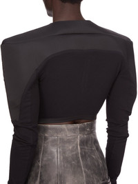 RICK OWENS SS25 HOLLYWOOD RUNWAY TIGHT TOP IN BLACK WASHED CHARMEUSE AND CLASSIC COTTON JERSEY THIS TIGHT TOP IS WAIST LENGTH. IT IS CLOSE-FITTING, WITH LONG SLEEVES, AND AN OPEN FRONT THAT SECURES WITH A LONG TIE THAT THEN WRAPS AROUND THE WAIST. IT FEATURES STRUCTURED, WIDE TATLIN SHOULDERS WITH A GIRDERED SHOULDER SEAM, AND YOKE THAT IS HORIZONTAL ACROSS THE CHEST AND DESCENDS DOWN THE ARM, TO FINISH IN A BLUNT POINT AT THE ELBOW THIS A COMBINATION OF WASHED CHARMEUSE AND CLASSIC COTTON JERSEY THIS LIGHTWEIGHT AND FLUID CHARMEUSE IS HAS A SEMI-SHINY SURFACE AND WASHED FINISH. THIS FABRIC IS MADE FROM CERTIFIED VISCOSE WHICH ENSURES THAT THE FIBERS ARE PRODUCED FROM RESPONSIBLY MANAGED SOURCES AND NO DEFORESTATION OCCURS COLOR: BLACK MATERIAL: 61% ACETATE + 39% VISCOSE BACK AND SLEEVES 100% COTTON MODEL IS 189CM TALL MODEL WEARS SIZE 48