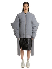 RICK OWENS FW22 STROBE RUNWAY GAUNTLET BOMBER IN REFLEX THIS GAUNTLET BOMBER IS HIP LENGTH, IT HAS A CENTRE FRONT ZIPPER, WITH TOP SNAP, TWO SIDE SLIT POCKETS WITH INTERNAL SNAPS, A RIBBED COLLAR AND LEVEL SHOULDER SEAMS. IT FEATURES GAUNTLET SLEEVES, WITH A WIDE PUFFED UPPER AND LOWER SLEEVE JUTTING OUT ABOVE THE ELBOW, ENCASING A SLIM INTERNAL SLEEVE. IT HAS AN EXTRA LONG RIBBED CUFF, WHICH CAN BE WORN HANGING, WITH TWO FINGER HOLES, OR GATHERED UP AT THE WRIST TO EXPOSE THE HAND. IT IS FULLY LINED WITH INTERNAL ZIPPERED POCKETS THIS RETROFLECTIVE MATERIAL IS WOVEN USING A SPECIALIZED YARN MADE FROM GLASS POWDER - COLOR: REFLEX - MATERIAL: 50% GLASS FIBRE + 25% POLYURETHANE + 25% POLYESTER - KNIT RIB COLLAR + SLEEVES + BOTTOM 100% NEW WOOL - POCKETS LINING 100% COTTEXTERNAL PADDING 100% POLYESTER - INTERNAL PADDING 90% GOOSE DOWN + 10% MALLARD FEATHERS - MODEL IS WEARING SIZE 48 - MODEL IS 189CM TALL