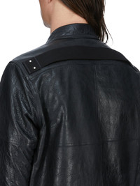 RICK OWENS SS26 TEMPLE BRAD JKT IN BLACK TUMBLED LAMB THIS BRAD JACKET IS HIP LENGTH WITH A STRAIGHT FIT AND LONG SLEEVES. IT HAS A CENTRE FRONT ZIP OPENING, CLASSIC COLLAR, DIAGONAL SIDE FRONT WELT POCKETS WITH AN INTERNAL SNAP, SNAP CUFFS AND DOUBLE TOPSTITCHING. IT FEATURES A CONCEALED ZIP POCKET IN THE LEFT FOREARM, THE SIGNATURE LEVEL SHOULDER SEAMS AND A COTTON WEBBING STRAP WITH RIVET DETAIL ON THE BACK YOKEIT IS FULLY LINED WITH TWO INTERNAL ZIPPED POCKETS THIS MEDIUMWEIGHT LAMB LEATHER IS VEG TANNED AND FINISHED WITH ANILINE. THE SURFACE TEXTURE, WHICH IS THE NATURAL GRAIN OF THE SKIN, IS ACHIEVED BY TUMBLING THE SKINS FOR 15 HOURS IN A WOODEN DRUM VEG TANNING MEANS ONLY VEGETAL AND NATURAL TANNINS WERE USED IN THE PROCESS OF TANNING AND PRESERVING THIS LEATHER THIS TANNERY IS LWG AUDITED COLOR: BLACK MATERIAL:100% LAMB LEATHER BODY AND POCKETS LINING 100% COTTON SLEEVES LINING 100% CUPRO MODEL IS 189CM TALL MODEL WEARS SIZE 48
