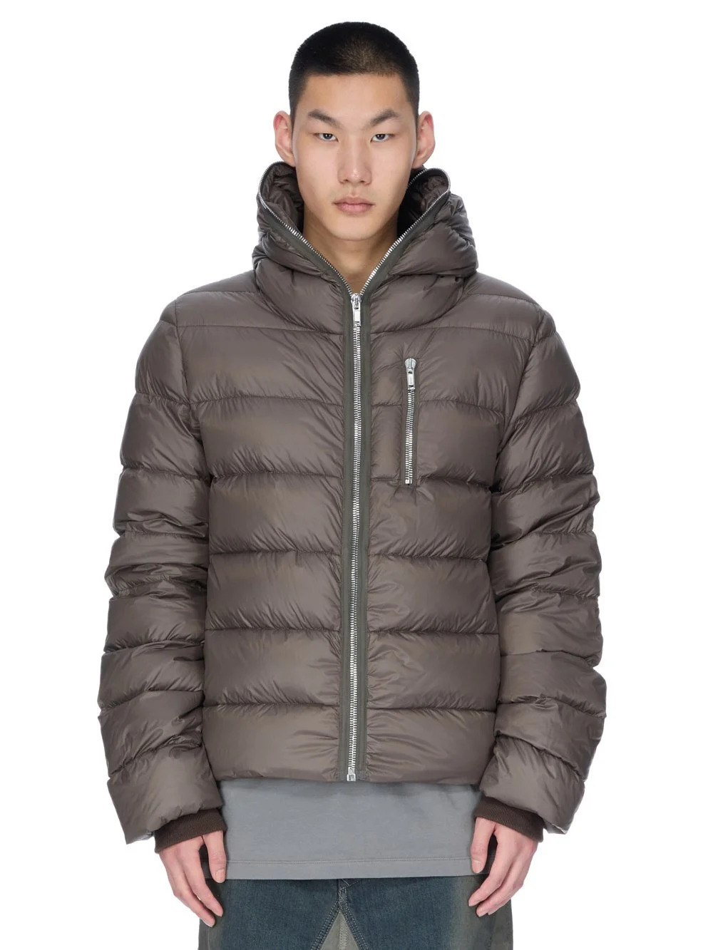 RICK OWENS FW25 CONCORDIANS GIMP JKT IN DARKDUST LIGHT NYLON THIS GIMP JKT IS HIP LENGTH WITH LONG SLEEVES. IT IS A HEAVYWEIGHT DUVET WITH HORIZONTAL STITCHING LINES. IT FEATURES A CENTRE FRONT ZIPPER THAT RUNS UP ALL AROUND THE HOOD, SO THAT IT CAN CLOSE COMPLETELY OVER THE FACE. IT HAS A ZIPPERED POCKET ON THE LEFT CHEST, AND SLIT POCKETS WITH CONCEALED SNAPS IN THE SIDE BODY THIS AIRY AND LIGHTWEIGHT NYLON IS MADE USING GRS CERTIFIED RECYCLED NYLON WHICH ENSURES A REDUCTION IN WATER CONSUMPTION, EMISSIONS AND HAZARDOUS WASTE, LESSENING THE DEPENDENCE ON NON-RENEWABLE RESOURCES COLOR: DARKDUST MATERIAL: 100% NYLON KNIT RIB CUFF 100% NEW WOOL POCKETS LINING 100%PADDING 90% GOOSE DOWN + 10% MALLARD FEATHERS MODEL IS 189CM TALL MODEL WEARS SIZE 48