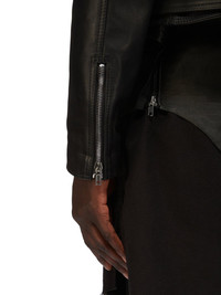 RICK OWENS FW24 PORTERVILLE RUNWAY CROPPED JUMBO BAUHAUS STOOGES IN BLACK DEEP OIL HORSE LEATHER THIS CROPPED JUMBO BAUHAUS STOOGES IS BELOW WAIST LENGTH WITH LONG SLEEVES AND A JUMBO, OVERSIZED FIT. IT FEATURES A BIKER, DOUBLE BREASTED, FRONT WITH OFF-CENTRE ZIPPER, A WIDE COLLAR AND LAPEL WITH SILVER YKK SNAPS. IT FEATURES A ROUNDED BAUHAUS ZIPPERED POCKET ON THE LEFT SIDE BODY, WITH AN ADDITIONAL FLAP POCKET THAT SECURES WITH A SNAP. IT HAS ZIPPERED SIDE POCKETS, A DIAGONAL ZIPPERED POCKET ON THE UPPER RIGHT ARM AS WELL AS A HORIZONTAL ZIPPER AT THE ELBOW, AND A ZIPPERED POCKET IN THE LEFT FOREARM. IT HAS ZIPPER OPENINGS AT THE CUFFS, SHOULDER EPAULETTES WITH SNAP DETAILS, AND A BELT RUNNING THROUGH BELT LOOPS AT THE WAISTBAND.THIS ITEM IS MADE IN JAPAN. ITS SNAP BUTTONS, AND EYELETS, ARE YKK (MADE IN JAPAN) AND ITS BELT BUCKLE IS SOLID BRASS WITH PALLADIUM PLATING, HAND MADE IN JAPANIT IS FULLY LINED AND HAS TWO INTERNAL ZIPPERED POCKETS. THIS HEAVYWEIGHT LEATHER IS A 1.5MM HORSEHIDE, CHROME TANNED IN HYŌGO PREFECTURE OF JAPAN, AN AREA KNOWN FOR ITS HIGH QUALITY TANNING - COLOR: BLACK - MATERIAL: 100% HORSE LEATHER - BODY LINING 100% COTTON - SLEEVES LINING 50% COTTON + 50% CUPRO - MODEL IS 189CM TALL - ITEM IS AVAILABLE IN ONE SIZE