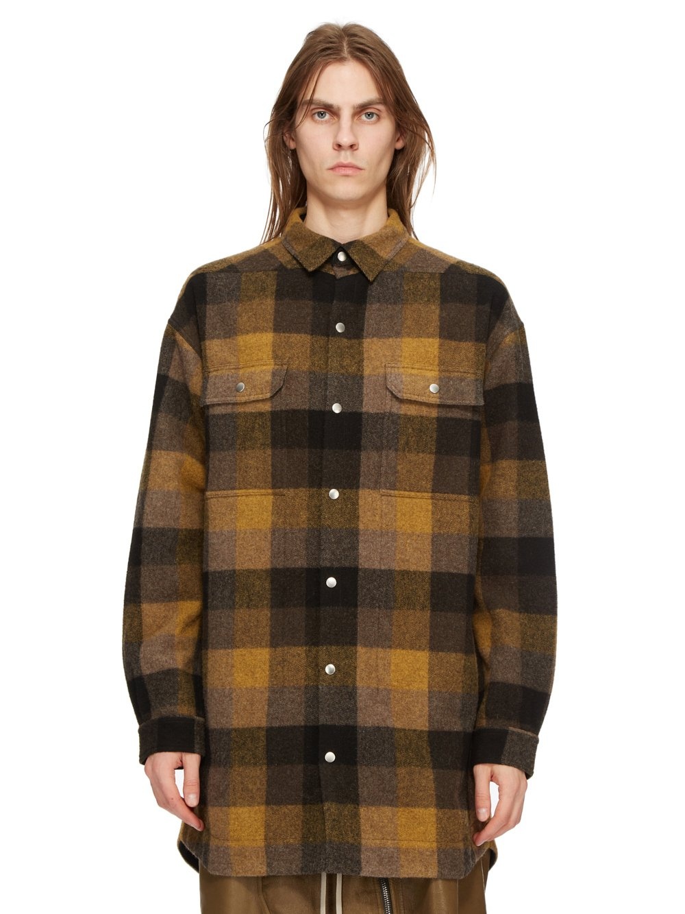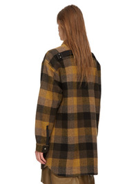 RICK OWENS FW24 PORTERVILLE OVERSIZED OUTERSHIRT IN HONEY PLAID LODENETTE PLAID THIS OVERSIZED OUTERSHIRT IS MID-THIGH LENGTH WITH AN OVERSIZED BOXY FIT. IT HAS A CENTRE FRONT OPENING WITH VISIBLE SNAP CLOSURES, A CLASSIC SHIRT COLLAR, BEVELED SIDE SEAMS WITH SPLITS, SNAP CUFFS AND DOUBLE TOPSTITCHING. IT FEATURES TWO CHEST POCKETS WITH BEVELED EDGE FLAP, VISIBLE SNAP CLOSURES. IT HAS THE SIGNATURE LEVEL SHOULDER SEAMS AND A COTTON WEBBING STRAP WITH RIVET DETAIL ON THE BACK YOKEIT IS UNLINED BUT HAS TWO INTERNAL ZIPPERED POCKETS THIS HEAVYWEIGHT PURE WOOL FABRIC HAS A BRUSHED AND SOFT HANDFEEL, EACH COLOR COMBINATION IS CREATED BY DYEING THE COTTON YARNS INDIVIDUALLY INTO FOUR DIFFERENT COLORS AND WEAVING THEM TOGETHER IN A SQUARE PLAID PATTERN. IT IS WOVEN BY 5TH GENERATION FAMILY OWNED MILL IN AUSTRIA FOUNDED IN 1888 THAT SPECIALIZES IN MAKING HEAVY WOOL COAT FABRICS TO BE WORN DURING THE ALPINE WINTERS. ONLY PURIFIED GLACIER WATER FROM THE DACHSTEIN GLACIER IS USED TO TREAT THIS FABRIC. THE WOOL USED IN THIS QUALITY IS MULESING FREE. - COLOR: HONEY PLAID - MATERIAL: 100% NEW WOOL - INSIDE POCKETS + YOKE LINING 100% COTTON - MODEL IS 189CM TALL - MODEL WEARS SIZE 48