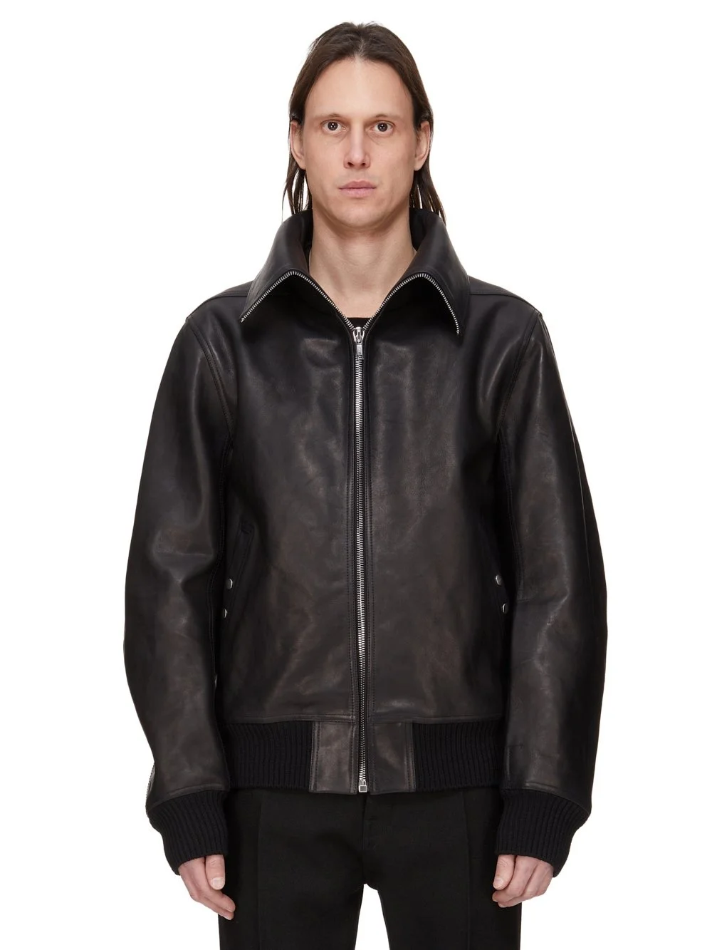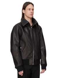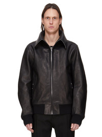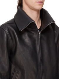 RICK OWENS FW25 CONCORDIANS RUNWAY BLIXA DRACUCOLLAR IN BLACK WASHED CALF LEATHER THIS BLIXA DRACUCOLLAR IS HIP LENGTH WITH LONG SLEEVES AND A CENTRE FRONT ZIPPER. IT FEATURES AN EXTENDED LENGTH COLLAR THAT CAN BE WORN UP OR DOWN AND HOLDS ITS SHAPE THANKS TO IT BEING REINFORCED WITH FUSING MATERIAL. IT FEATURES TWO-SNAP POCKET CLOSURE DETAIL ON SIDE POCKETS, AND HAS RIBBED CUFFS AND WAISTBAND. IT IS FULLY LINED AND HAS TWO INTERNAL ZIPPERED POCKETS THIS HEAVYWEIGHT COW LEATHER IS VEG TANNED AND FINISHED USING NATURAL WAXES. A FINAL WASH GIVES THIS LEATHER ITS SOFTNESS AND BRINGS OUT THE NATURAL GRAIN TEXTURE OF EACH SKIN. BECAUSE THIS SKIN IS NAKED, NOT FINISHED USING ANY PIGMENTS COVERING THE SKIN, NATURAL MARKINGS AND SHADINGS ARE VISIBLE WHICH MAKES EACH SKIN AND PRODUCT UNIQUE VEG TANNING MEANS ONLY VEGETAL AND NATURAL TANNINS WERE USED IN THE PROCESS OF TANNING AND PRESERVING THIS LEATHER THIS TANNERY IS LWG CERTIFIED WITH A SILVER RATING COLOR: BLACK MATERIAL: 100% CALF LEATHER KNIT RIB CUFFS AND BOTTOM 94% NEW WOOL + 5% NYLON + 1% ELASTANE MODEL IS 189CM TALL MODEL WEARS SIZE 48