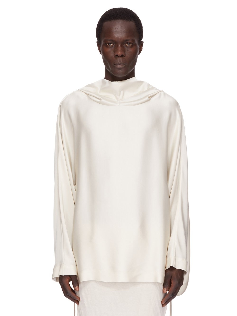 RICK OWENS SS25 HOLLYWOOD RUNWAY HOODED TUNIC IN DINGE WASHED CHARMEUSE THIS HOODED TUNIC IS HIP LENGTH WITH LONG SLEEVES. IT HAS A LARGE HOOD THAT DRAPES AT THE FRONT NECK, AND A WIDE SQUARE BODY THAT CAN BE GATHERED IN, WITH A CORD AT THE WAIST THIS LIGHTWEIGHT AND FLUID CHARMEUSE IS HAS A SEMI-SHINY SURFACE AND WASHED FINISH. THIS FABRIC IS MADE FROM CERTIFIED VISCOSE WHICH ENSURES THAT THE FIBERS ARE PRODUCED FROM RESPONSIBLY MANAGED SOURCES AND NO DEFORESTATION OCCURS COLOR: DINGE MATERIAL: 61% ACETATE + 39% VISCOSE MODEL IS 189CM TALL MODEL WEARS SIZE 48