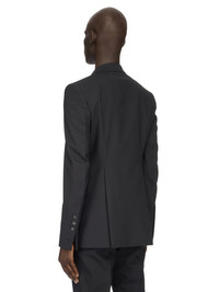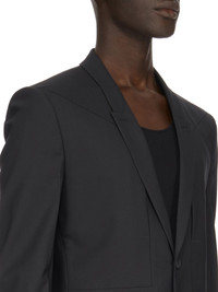 RICK OWENS FW23 LUXOR SOFT SOFT BLAZER IN PAPER FINISH WOOL THIS SOFT SOFT BLAZER IS BELOW HIP LENGTH, WITH LONG SLEEVES AND A CLASSIC SOFT SHOULDER PAD. IT HAS A LAPEL WITH A SINGLE BUTTON FRONT CLOSURE, TWO SIDE FRONT JET FLAP POCKETS, A WELT POCKET ON THE LEFT BREAST. IT HAS A DOUBLE VENT ON BACK. AND FIVE-BUTTON CUFFS IT IS FULLY LINED AND HAS FOUR INTERNAL BUTTONED POCKETS THIS MEDIUMWEIGHT WOOL FABRIC HAS A DRY PAPERY HANDFEEL. IT IS WOVEN IN THE BIELLA REGION OF ITALY RENOWNED FOR ITS LONG TRADITION OF TAILORED WOOL. THIS FABRIC IS MADE FROM ZQ CERTIFIED VIRGIN WOOL WHICH ENSURES A HIGH STANDARD IN ANIMAL WELFARE, ENVIRONMENTAL SUSTAINABILITY AND SOCIAL RESPONSIBILITY. EACH BALE OF WOOL IS TRACEABLE BACK TO ITS SOURCE. - COLOR: BLACK - MATERIAL: 96% NEW WOOL + 4% ELASTANE - BODY LINING 53% VISCOSE + 47% CUPRO - SLEEVES LINING 100% CUPRO - POCKETS LINING 100% COTTON - BUTTONS 100% BUFFALO HORN - MODEL IS WEARING SIZE 48 - MODEL IS 189 CM TALL