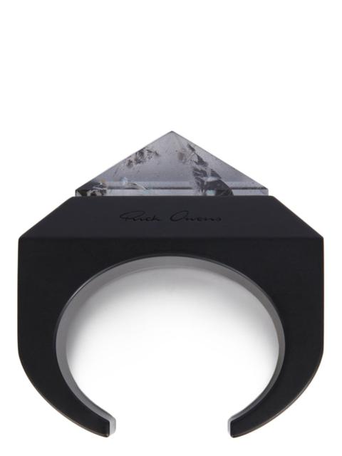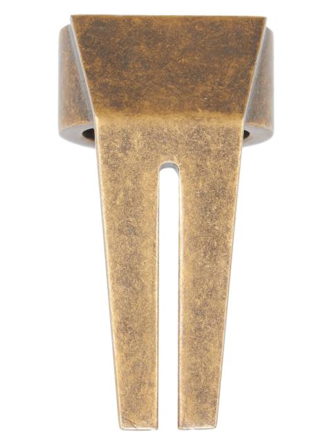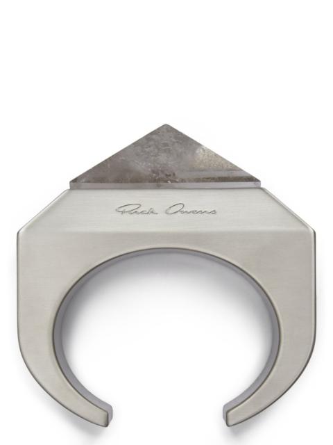 RICK OWENS OPEN TRUNK RING IN BRASS THIS OPEN TRUNK RING IS A THICK BAND WHICH EXTENDS INTO A GEOMETRIC TRUNK SHAPE WITH AN OPEN FACE CENTRE SLIT AND BEVELED EDGES AND THE RICK OWENS LOGO ENGRAVED ON THE BACK. THESE JEWELLERY PIECES ARE CRAFTED WITH THE INDIVIDUAL HANDWORK OF THE ARTISAN, MAKING EACH PIECE UNIQUEBRASS METAL WITH A BRUSHED PALLADIUM FINISH - COLOR: PALLADIO - MATERIAL: 100% BRASS