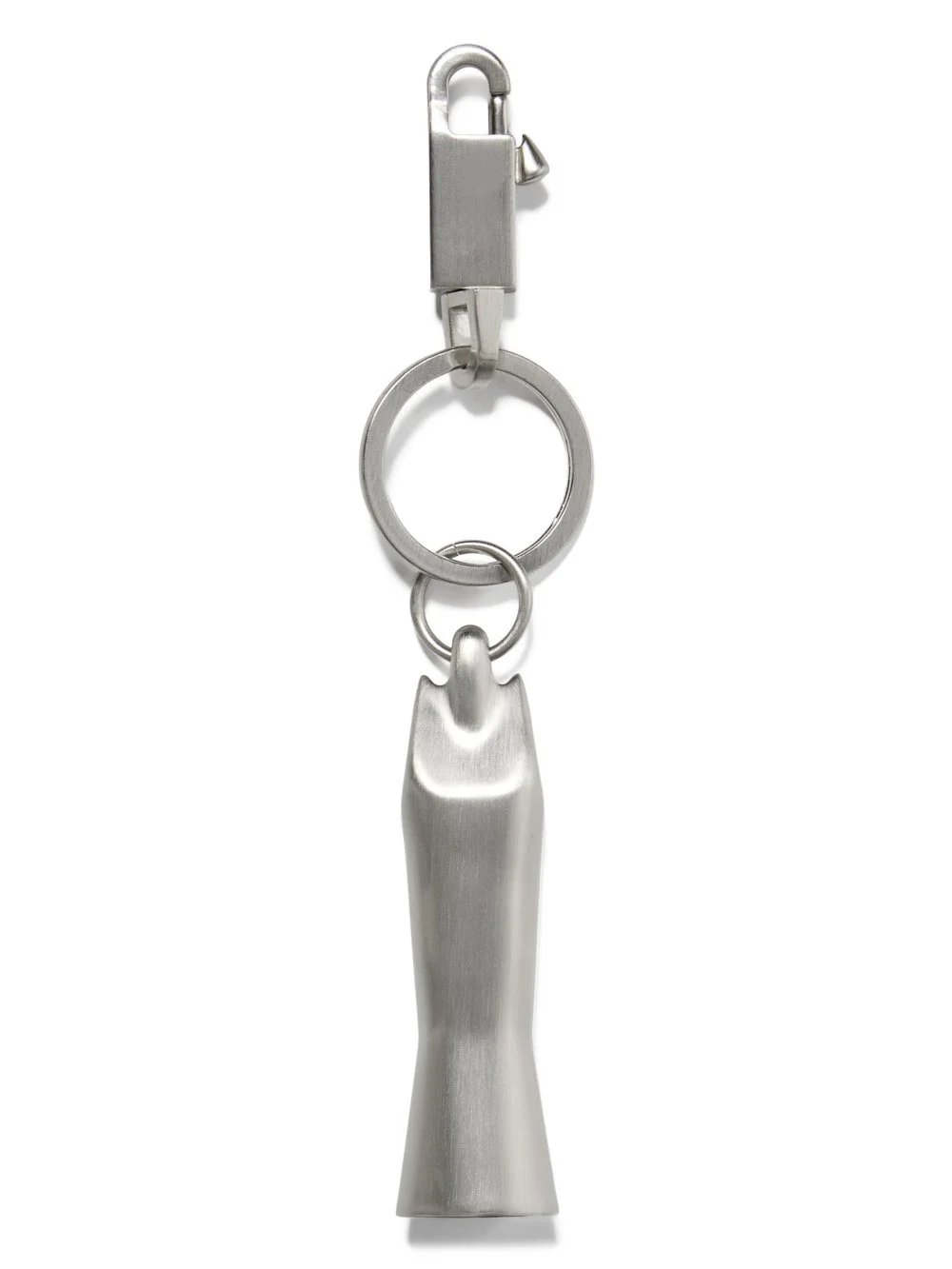RICK OWENS SS26 TEMPLE SISTER KEYCHAIN IN PALLADIUM PALLADIUM TONE BRASS THIS MEGA SISTER CHARM IS A REPLICA OF THE TEMPLE STATUES PLACED OUTSIDE THE MUSEE GALLIERA IN PARIS AS PART OF THE RICK OWENS RETROSPECTIVE EXHIBITION "TEMPLE OF LOVE" THIS IS BRASS METAL WITH A BRUSHED PALLADIUM FINISH COLOR: PALLADIUM MATERIAL:100% ALUMINIUM SNAP 100% BRASS RING 100% IRON HEIGHT 8,5CM_WIDTH 2CM
