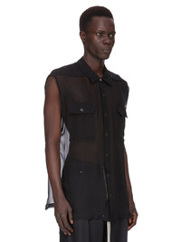 RICK OWENS SS25 HOLLYWOOD RUNWAY JUMBO SL OUTERSHIRT IN BLACK SILK CHIFFON THIS JUMBO SL OUTERSHIRT IS BELOW-HIP LENGTH AND SLEEVELESS WITH A JUMBO BOXY FIT. IT HAS A CLASSIC COLLAR AND VISIBLE SNAP FRONT CLOSURES, BEVELED SIDE SEAMS AND DOUBLE TOPSTITCHING. IT FEATURES SIGNATURE LEVEL SHOULDER SEAMS AND A COTTON WEBBING STRAP WITH RIVET DETAIL ON THE BACK YOKE THIS LIGHTWEIGHT AND SEMI-TRANSPARENT SILK CHIFFON IS FLUID WITH A MATTE SURFACE AND DRY HANDFEEL. IT IS WOVEN IN THE COMO REGION OF ITALY KNOWN FOR ITS HERITAGE OF SILK PRODUCTION. THIS FABRIC IS MADE USING GOTS CERTIFIED ORGANIC SILK BECAUSE IT MEANS THE NATURAL FIBER IS MADE WITHOUT HARMFUL CHEMICALS, WHICH LEAVES OUR SOIL, AIR AND WATER CLEANER FROM CONTAMINATES COLOR: BLACK MATERIAL: 100% SILK MODEL IS 189CM TALL MODEL WEARS SIZE 48