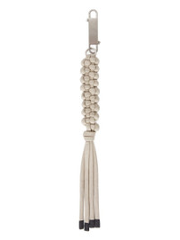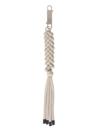 MONCLER + RICK OWENS SS26 HIKING ROPE KEYRING IN PEARL COTTON CORD THIS MONCLER + RICK OWENS HIKING ROPE KEYRING HAS A KNOTTED COTTON CORD BODY WITH DANGLING COATED CORD ENDS AND A RING ATTACHED TO A RICK OWENS CARABINER, FEATURING THE MONCLER + RICK OWENS ETCHED LOGO. COLOR: PEARL MATERIAL: COTTON CORD IT MEASURES 48 CM X 19 CM X 6 CM.