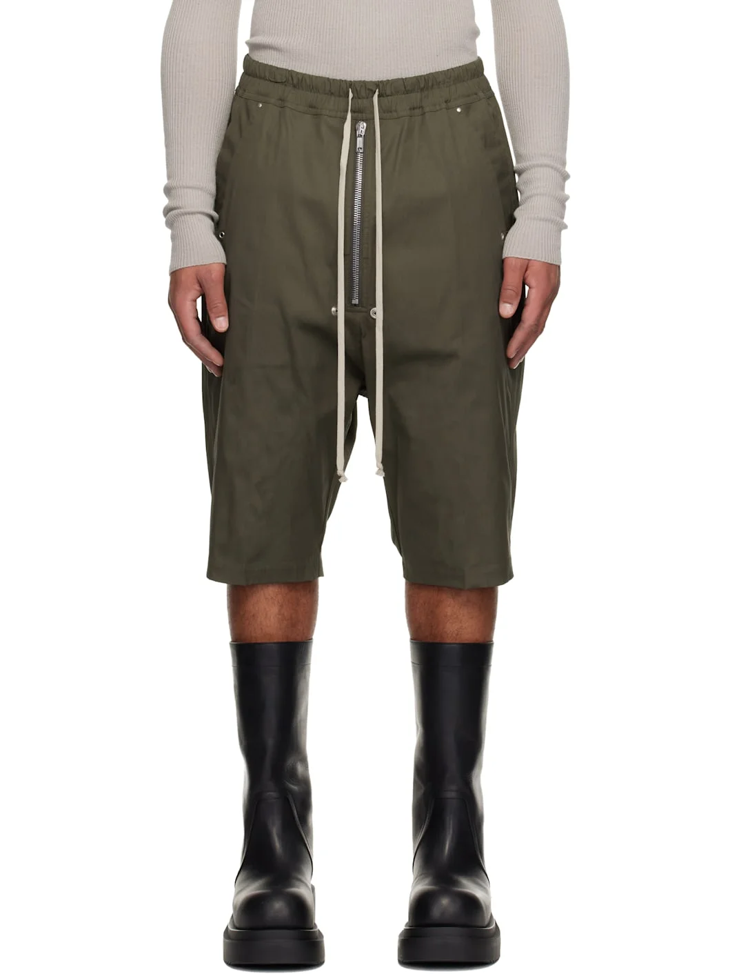 Stretch organic cotton poplin shorts. · Drawstring at elasticized waistband · Four-pocket styling · Exposed zip fly · Rivets, grommets, and press-stud hardware at front · Dropped inseam Supplier color: Bosco 97% cotton, 3% elastane. Made in Italy 252232M193030