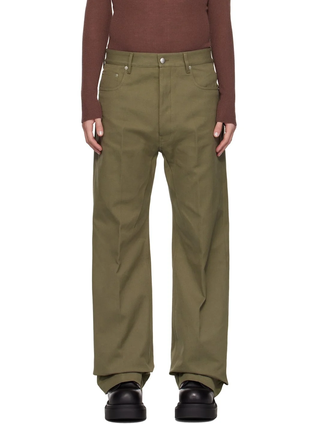 Wide-leg non-stretch denim jeans. · Mid-rise · Belt loops · Three-pocket styling · Button-fly · Creased legs · Darts at inseam Supplier color: Olive drab 100% cotton. Made in Italy 242232M186020