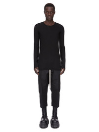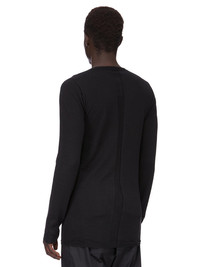 RICK OWENS FOREVER ROUND NECK SWEATER IN BLACK LIGHTWEIGHT RASATO KNIT THIS ROUND NECK SWEATER HAS A BELOW-THE-HIP LENGTH WITH LONG SLEEVES. IT HAS A ROUND NECK WITH RIBBED NECK LINE, CUFFS AND HEM. IT FEATURES A SIGNATURE KNIT LINE RUNNING DOWN THE CENTRE BACK SPINE THIS IS A LIGHTWEIGHT AND SOFT CLASSIC STITCH CASHMERE KNIT. FLAGSHIP STORES AND ONLINE ITEM. COLOR: BLACK. MATERIAL: 100%CASHMERE. MODEL IS WEARING SIZE: S. MODEL IS 189CM TALL.