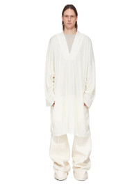 RICK OWENS FW25 CONCORDIANS RUNWAY LS KAFTAN KNEE IN NATURAL SILK WOOL JERSEY THIS LS KAFTAN KNEE IS KNEE LENGTH WITH LONG, WIDE SLEEVES. IT HAS A LARGE HOOD WITH A V NECK AND SEAM RUNNING DOWN THE CENTRE FRONT AND BACK. IT IS A VOLUMINOUS KAFTAN SHAPE, WITH A WIDE SHOULDER FALLING INTO A DROPPED ARMHOLE. THIS LIGHTWEIGHT SILK AND WOOL BLEND JERSEY HAS A SOFT HANDFEEL AND SEMI SHINY SURFACE. THIS JERSEY IS MADE FROM RWS CERTIFIED VIRGIN WOOL WHICH ENSURES A HIGH STANDARD IN ANIMAL WELFARE, ENVIRONMENTAL SUSTAINABILITY AND SOCIAL RESPONSIBILITY. EACH BALE OF WOOL IS TRACEABLE BACK TO ITS SOURCE. WE STRIVE TO KEEP OUR PRODUCTION AS LOCAL AS POSSIBLE. THE FULL MANUFACTURING CYCLE OF THIS PRODUCT, FROM THE MATERIAL KNITTING TO SEWING AND FINISHING, WAS UNDERTAKEN CLOSE TO OUR HOME BASE IN CONCORDIA, ITALY. COLOR: NATURAL MATERIAL: 70% NEW WOOL + 30% SILK MODEL IS 189CM TALL ITEM IS AVAILABLE IN ONE SIZE