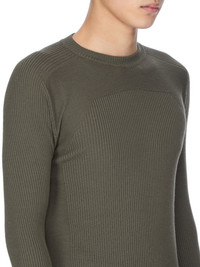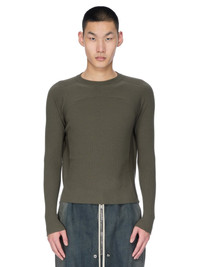 RICK OWENS FW25 CONCORDIANS RIBBED GEO IN BOSCO RIBBED KNIT THIS RIBBED GEO SWEATER IS ABOVE HIP LENGTH WITH A SLIM FIT AND LONG SLEEVES. IT HAS A RIBBED ROUND NECK, BACK AND RIBBED PATTERN ON THE SHOULDERS. IT HAS A CONTRAST FLAT KNIT GEO DESIGN ON THE FRONT CHEST AND SIGNATURE KNIT LINE RUNNING DOWN THE CENTRE BACK SPINE THIS LIGHTWEIGHT AND CLASSIC RIBBED WOOL KNIT HAS A SOFT HANDFEEL COLOR: BOSCO MATERIAL: 100% NEW WOOL MODEL IS 189CM TALL MODEL WEARS SIZE M