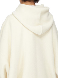 RICK OWENS FW25 CONCORDIANS RUNWAY GIMP HOODIE IN MILK ALPACA KNIT THIS GIMP HOODIE IS MID THIGH LENGTH WITH AN OVERSIZE FIT. IT HAS LONG SLEEVES WITH LOW SHOULDERS AND A DROPPED ARMHOLE, A LARGE HOOD AND TWO FRONT PATCH POCKETS. IT FEATURES IT HAS A FRONT ZIPPER CLOSURE THAT RUNS FROM THE HEM ALL THE WAY UP THROUGH THE HOOD, ALLOWING IT TO BE ZIPPED COMPLETELY CLOSED OVER THE FACE. THIS IS A DENSE BUT LIGHT KNIT WITH A SOFT SLIGHTLY FLUFFY HAND. COLOR: MILK MATERIAL: 48% ALPACA + 30% NYLON + 20% WOOL + 2% ELASTANE MODEL IS 189CM TALL MODEL WEARS SIZE L