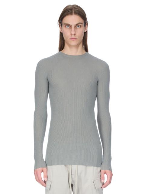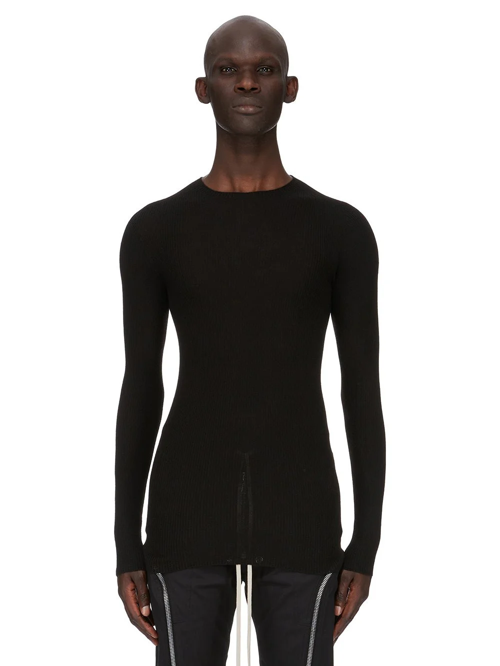 RICK OWENS FW25 CONCORDIANS RIBBED ROUND NECK IN BLACK RIBBED KNIT THIS RIBBED ROUND NECK SWEATER IS BELOW HIP LENGTH WITH A CLOSE TO THE BODY FIT. IT IS A RIBBED KNIT WITH LONG SLEEVES, A ROUND NECK AND A RIBBED PATTERN ON THE SHOULDER. IT HAS A SIGNATURE KNIT LINE RUNNING DOWN THE CENTRE BACK SPINE. THIS LIGHTWEIGHT AND CLASSIC RIBBED WOOL KNIT HAS A SOFT HANDFEEL. COLOR: BLACK MATERIAL: 100% NEW WOOL MODEL IS 189CM TALL MODEL WEARS SIZE M