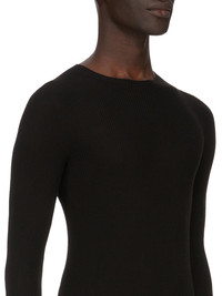 RICK OWENS FW25 CONCORDIANS RIBBED ROUND NECK IN BLACK RIBBED KNIT THIS RIBBED ROUND NECK SWEATER IS BELOW HIP LENGTH WITH A CLOSE TO THE BODY FIT. IT IS A RIBBED KNIT WITH LONG SLEEVES, A ROUND NECK AND A RIBBED PATTERN ON THE SHOULDER. IT HAS A SIGNATURE KNIT LINE RUNNING DOWN THE CENTRE BACK SPINE THIS LIGHTWEIGHT AND CLASSIC RIBBED WOOL KNIT HAS A SOFT HANDFEEL COLOR: BLACK MATERIAL: 100% NEW WOOL MODEL IS 189CM TALL MODEL WEARS SIZE M