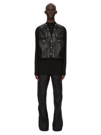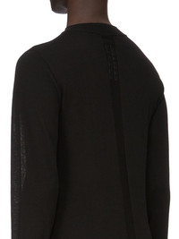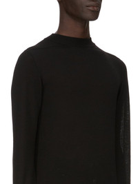 RICK OWENS FW25 CONCORDIANS LEVEL LUPETTO IN BLACK LIGHTWEIGHT RASATO KNIT THIS LEVEL LUPETTO IS HIP LENGTH WITH LONG SLEEVES. IT HAS A SMALL FUNNEL NECK, WITH RIBBED NECK, CUFFS AND HEM. IT FEATURES THE SIGNATURE LEVEL SHOULDER SEAMS AND A KNIT LINE RUNNING DOWN THE CENTRE BACK SPINE THIS LIGHTWEIGHT AND CLASSIC STITCH WOOL KNIT HAS A SOFT HANDFEEL COLOR: BLACK MATERIAL: 100% NEW WOOL MODEL IS 189CM TALL MODEL WEARS SIZE M