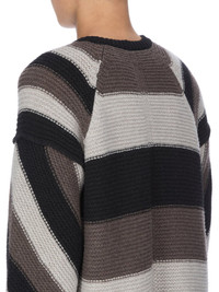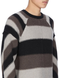 RICK OWENS FW25 CONCORDIANS PITTI IN BLACK/PEARL/DUST HEAVY WOOL KNIT THIS PITTI SWEATER IS HIP LENGTH WITH LONG SLEEVES AND A LOOSE ROUNDED FIT. IT HAS A RIBBED ROUND NECK, COLLAR AND CUFFS. IT FEATURES OUR TRICOLOR HEAVY WOOL KNIT AND HAS A SIGNATURE KNIT CHANNEL RUNNING DOWN THE CENTRE FRONT AND BACK SPINE THIS IS A HEAVY WOOL FISHERMAN KNIT COLOR: BLACK/PEARL/DUST MATERIAL: 100% NEW WOOL MODEL IS 189CM TALL MODEL WEARS SIZE L