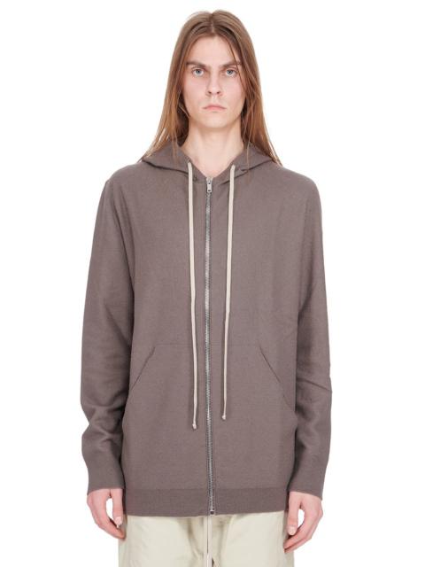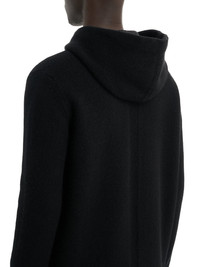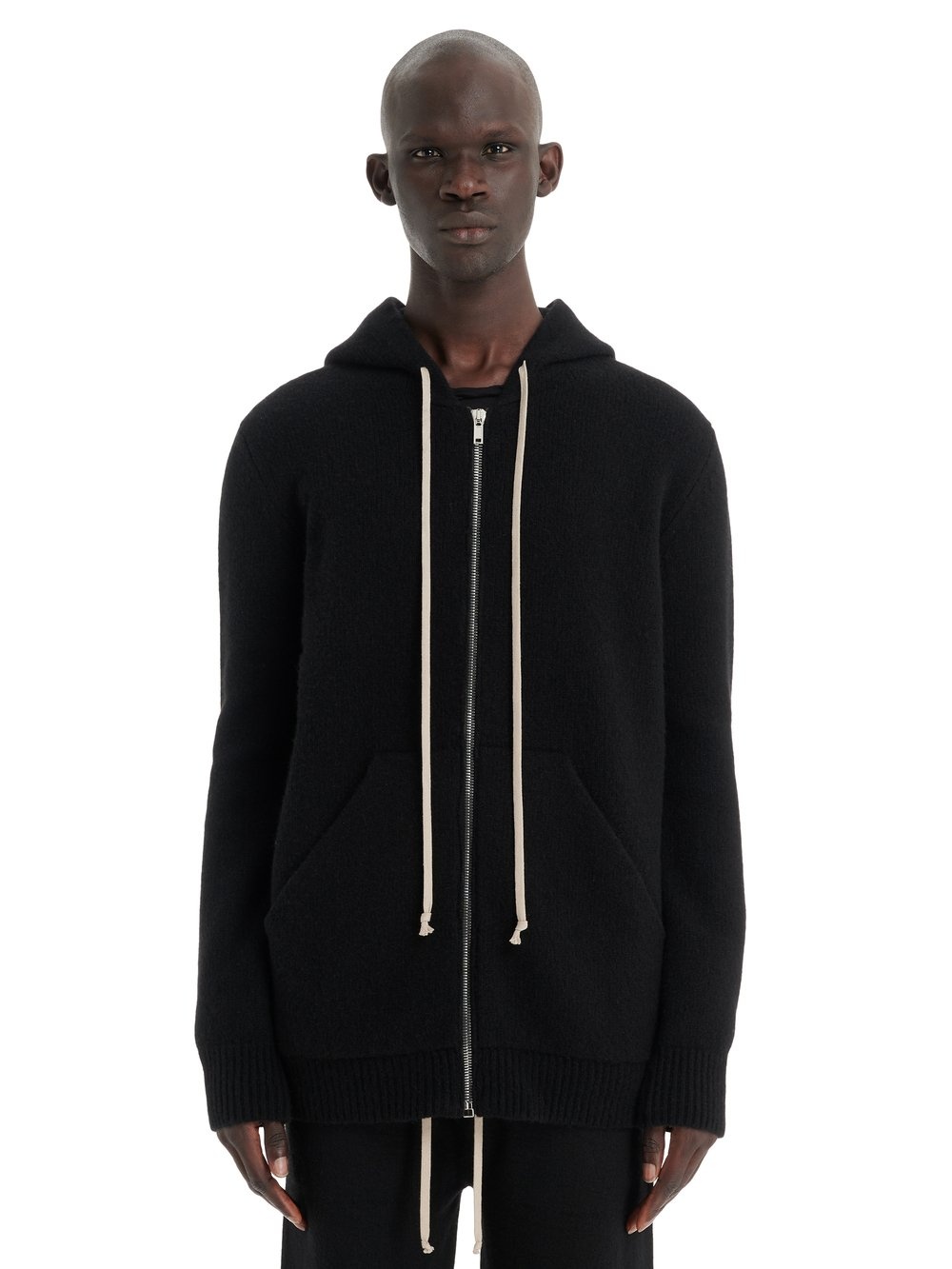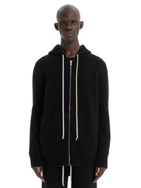 RICK OWENS FW22 STROBE ZIPPED HOODIE IN BOILED CASHMERE KNIT THIS ZIPPED HOODIE IS BELOW HIP LENGTH, HAS LONG SLEEVES AND RIBBED CUFFS AND HEM. IT HAS A CENTRE FRONT ZIPPER, TWO FRONT POCKETS, A DRAWSTRING HOOD AND A SIGNATURE KNIT LINE RUNNING DOWN THE CENTRE BACK SPINE THIS CASHMERE KNIT IS FINISHED WITH AN ARTISANAL TREATMENT TO ACHIEVE THE LOFTY AND SOFT HANDFEEL - COLOR: BLACK - MATERIAL: 100% CASHMERE - MODEL IS WEARING SIZE 48 - MODEL IS 189 CM TALL