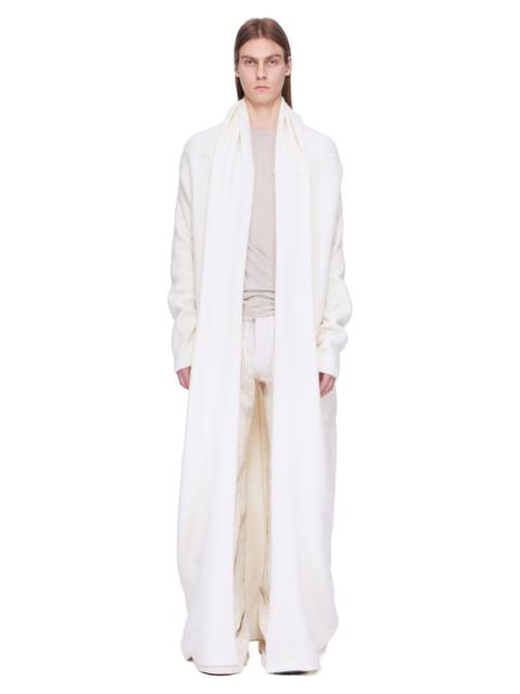 RICK OWENS FW25 CONCORDIANS RUNWAY LONG CARDIGAN IN BLACK ALPACA KNIT THIS LONG CARDIGAN IS FLOOR LENGTH. IT HAS LONG SLEEVES WITH A DROPPED SHOULDER, IS OPEN FRONTED AND HAS FRONT SIDE PATCH POCKETS. IT FEATURES A RUCHED EFFECT BEHIND THE NECK, ENABLING THIS PART TO BE PULLED UP OVER THE HEAD LIKE A HOOD THIS IS A DENSE BUT LIGHT KNIT WITH A SOFT SLIGHTLY FLUFFY HAND COLOR: BLACK MATERIAL: 48% ALPACA + 30% NYLON + 20% WOOL + 2% ELASTANE MODEL IS 189CM TALL MODEL WEARS SIZE M