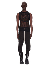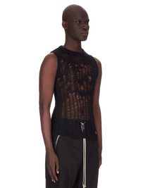 RICK OWENS SS24 LIDO SPIDER TANK IN BLACK NET KNIT THIS SPIDER TANK IS ABOVE-HIP LENGTH AND SLEEVELESS WITH WIDE TANK SHOULDERS AND A RIBBED ROUND NECK, AND RIBBED HEMLINE THIS IS A NET KNIT WITH UNEVEN HOLES- COLOR: BLACK - MATERIAL: 50% NYLON + 46% MOHAIR + 4% WOOL - MODEL IS 189CM TALL - MODEL WEARS SIZE M