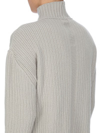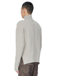 RICK OWENS FW25 CONCORDIANS TURTLE NECK IN PEARL HEAVY WOOL KNIT THIS TURTLE NECK IS HIP LENGTH WITH LONG SLEEVES. IT FEATURES A RIBBED TURTLE NECK, HEM AND CUFFS. IT HAS A SIGNATURE KNIT LINE RUNNING DOWN THE CENTRE BACK SPINE. THIS IS A HEAVY WOOL FISHERMAN KNIT. COLOR: PEARL MATERIAL: 100% NEW WOOL MODEL IS 189CM TALL MODEL WEARS SIZE M