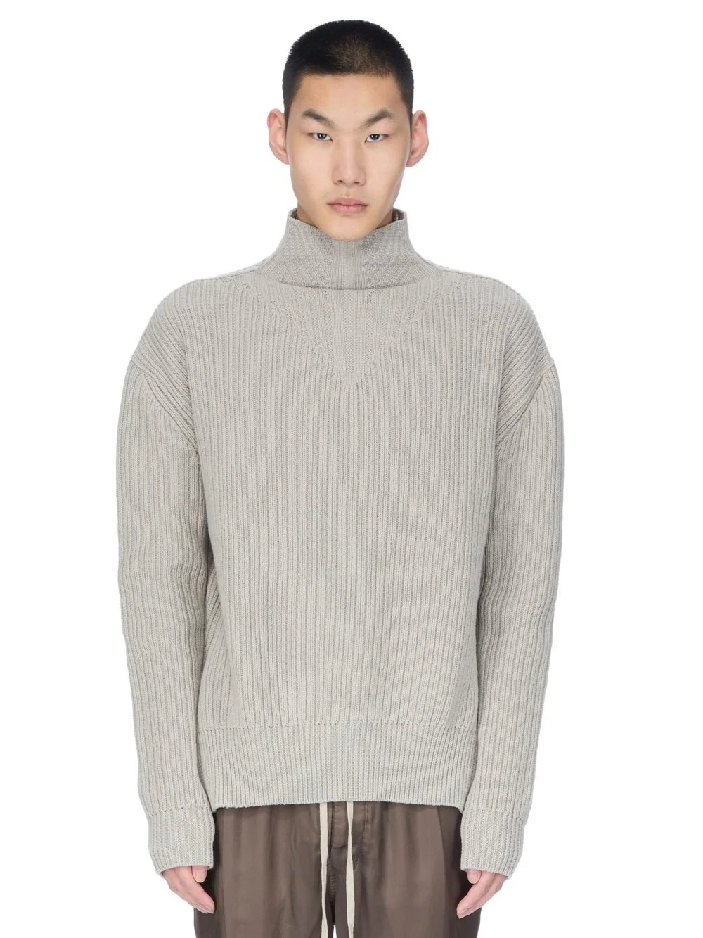 RICK OWENS FW25 CONCORDIANS TURTLE NECK IN PEARL HEAVY WOOL KNIT THIS TURTLE NECK IS HIP LENGTH WITH LONG SLEEVES. IT FEATURES A RIBBED TURTLE NECK, HEM AND CUFFS. IT HAS A SIGNATURE KNIT LINE RUNNING DOWN THE CENTRE BACK SPINE THIS IS A HEAVY WOOL FISHERMAN KNIT COLOR: PEARL MATERIAL: 100% NEW WOOL MODEL IS 189CM TALL MODEL WEARS SIZE M