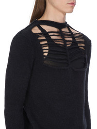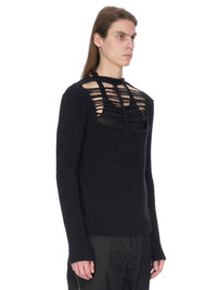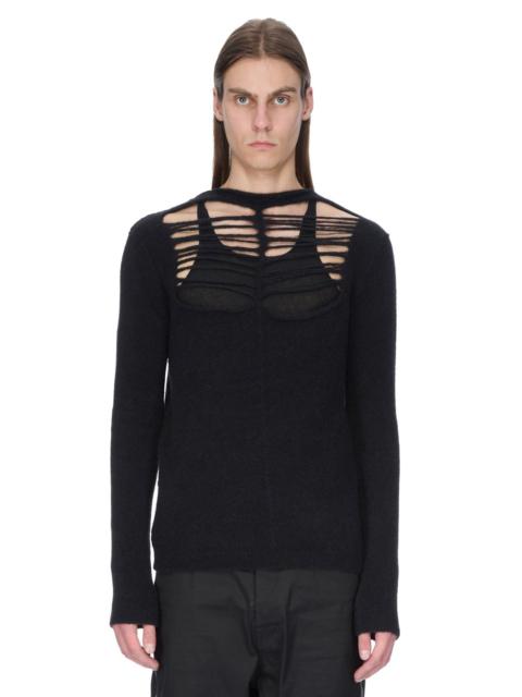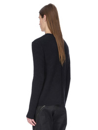 RICK OWENS FW25 CONCORDIANS LS TOP IN BLACK ALPACA GRID KNIT THIS LS TOP IS HIP LENGTH. THIS LONG SLEEVE TOP FEATURES OUR OPEN RIB KNIT, HAS A SLIGHT BOAT NECK, AND IS BODY REVEALING ON FRONT CHEST. IT HAS A SIGNATURE CHANNEL DOWN THE CENTRE BACK THIS A DENSE BUT LIGHT KNIT WITH A SOFT SLIGHTLY FLUFFY HAND IT IS KNITTED IN AN OPEN RIB PATTERN THAT VARIES THROUGHOUT THE GARMENT COLOR: BLACK MATERIAL: 48% ALPACA + 30% NYLON + 20% WOOL + 2% ELASTANE MODEL IS 189CM TALL MODEL WEARS SIZE M
