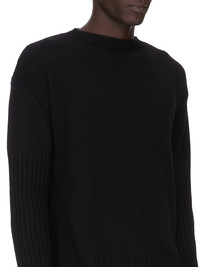 RICK OWENS FW25 CONCORDIANS ROUND NECK IN BLACK LAS PALMAS CASHMERE KNIT THIS ROUND NECK IS HIP LENGTH WITH LONG SLEEVES. IT HAS A RIBBED ROUND NECK AND FEATURES A MEGARIB KNIT DESIGN WITH WIDE RIB LINES RUNNING VERTICALLY DOWN THE ARMS. IT FEATURES SIGNATURE KNIT LINE RUNNING DOWN THE CENTRE BACK SPINE THIS HEAVYWEIGHT CASHMERE KNIT HAS A SOFT AND WARM HANDFEEL IT IS KNITTED BOTH IN A CLASSIC RASATO STITCH AND A WIDE RIB COLOR: BLACK MATERIAL: 100% CASHMERE MODEL IS 189CM TALL MODEL WEARS SIZE M