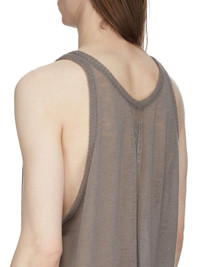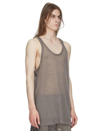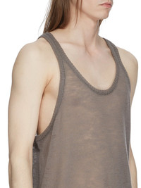RICK OWENS SS24 LIDO RUNWAY CUNT TANK IN DUST GEOPUNTO THIS CUNT TANK IS BELOW HIP LENGTH WITH A LOOSE FIT. IT HAS A LOW ROUND NECKLINE AND THIN SHOULDER STRAPS THAT FLOW INTO A SLIGHT RACER BACK, AND DIP INTO LOW UNDERARMS. IT FEATURES THE SIGNATURE SINGLE SEAM RUNNING DOWN THE CENTRE BACK SPINETHIS VERSION HAS THE WORD 'CUNT' KNIT INTO THE FRONT CHESTTHIS IS A VERY LIGHTWEIGHT SHEER KNIT FEATURING A KNIT GRAPHIC - COLOR: DUST - MATERIAL: 100% NEW WOOL - MODEL IS 189CM TALL - ITEM IS AVAILABLE IN ONE SIZE