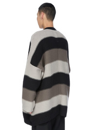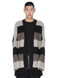 RICK OWENS FW25 CONCORDIANS PITTI CARDIGAN IN BLACK/PEARL/DUST HEAVY WOOL KNIT THIS PITTI CARDIGAN IS BELOW HIP LENGTH WITH LONG SLEEVES AND A LOOSE ROUNDED FIT WITH LOW SHOULDERS. IT HAS A RIBBED EDGE AND CUFFS. IT FEATURES OUR TRICOLOR HEAVY WOOL KNIT AND HAS A SIGNATURE KNIT CHANNEL RUNNING DOWN THE CENTRE BACK SPINE THIS IS A HEAVY WOOL FISHERMAN KNIT COLOR: BLACK/PEARL/DUST MATERIAL: 100% NEW WOOL MODEL IS 189CM TALL MODEL WEARS SIZE L