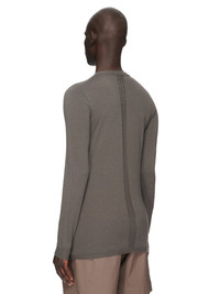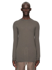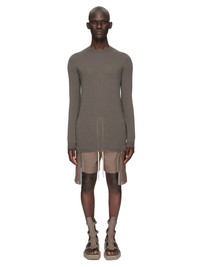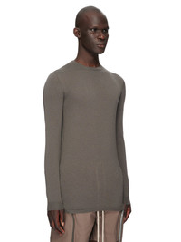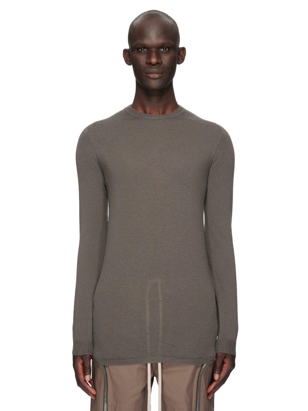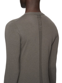 RICK OWENS SS23 EFDU BIKER LEVEL ROUND NECK IN DUST GREY LIGHTWEIGHT RASATO KNIT THIS BIKER LEVEL ROUND NECK SWEATER IS HIP LENGTH WITH LONG SLEEVES. IT HAS A RIBBED ROUND NECK, CUFFS AND HEM. IT FEATURES SIGNATURE LEVEL SHOULDER SEAMS AND A KNIT LINE RUNNING DOWN THE CENTRE BACK SPINE THIS IS A LIGHTWEIGHT AND SOFT CLASSIC STITCH WOOL KNIT - COLOR: DUST GREY - MATERIAL: 100% NEW WOOL - MODEL IS WEARING SIZE S - MODEL IS 189 CM TALL