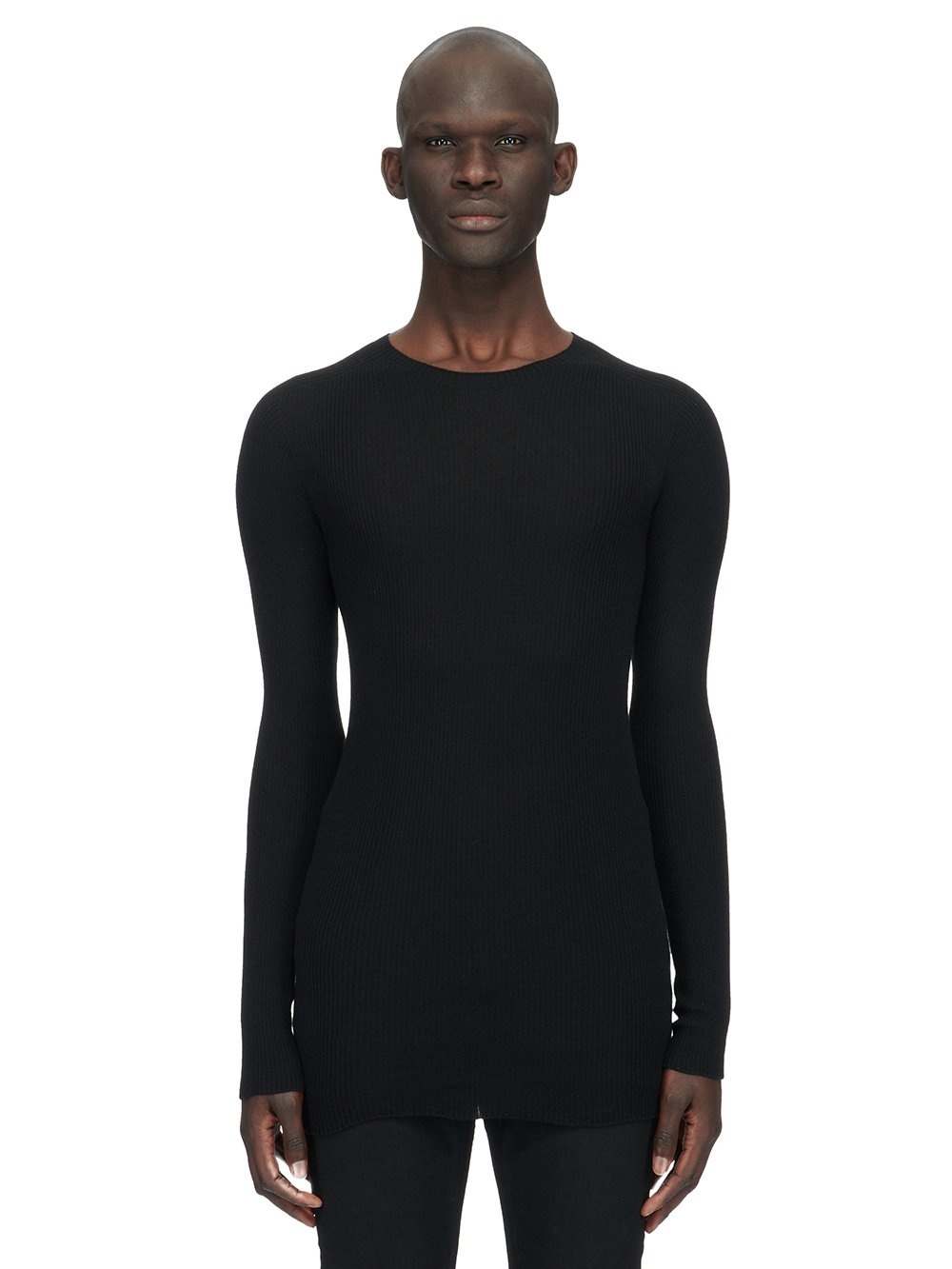 RICK OWENS SS23 EFDU RIBBED ROUND NECK IN BLACK LIGHTWEIGHT RIBBED KNIT THIS RIBBED ROUND NECK SWEATER IS BELOW HIP LENGTH WITH A CLOSE TO THE BODY FIT. IT IS A FULLY FASHIONED RIBBED KNIT WITH LONG SLEEVES, A ROUND NECK, AND A RIBBED PATTERN ON THE SHOULDER. IT HAS A SIGNATURE KNIT LINE RUNNING DOWN THE CENTRE BACK SPINE THIS IS A LIGHTWEIGHT AND SOFT CLASSIC RIBBED WOOL KNIT - COLOR: BLACK - MATERIAL: 100% NEW WOOL - MODEL IS WEARING SIZE S - MODEL IS 189 CM TALL
