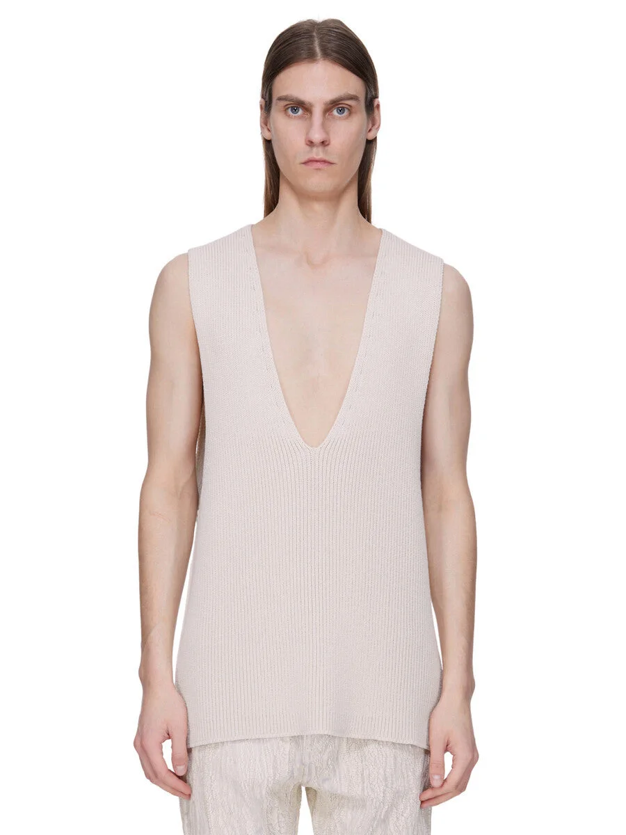 RICK OWENS FW25 CONCORDIANS RUNWAY V TANK IN NATURAL WOOL THIS V TANK IS HIP LENGTH WITH A SQUARE LOOSE FIT. IT IS SLEEVELESS WITH A DEEP V NECKLINE AND LOW CUT ARMHOLES. IT FEATURES THE SIGNATURE KNIT CHANNEL RUNNING DOWN THE SPINE. COLOR: NATURAL MATERIAL: 100% NEW WOOL MODEL IS 189CM TALL MODEL WEARS SIZE L