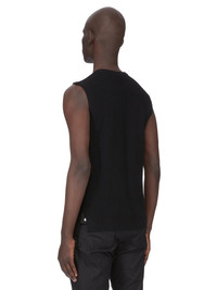 RICK OWENS SS26 TEMPLE TANK IN BLACK HEAVY WOOL KNIT THIS TANK IS ABOVE HIP LENGTH WITH A SLIM FIT. IT HAS A RIBBED ROUND NECK, BACK AND LOWER FRONT WITH A PRONG PATTERN ON THE CHEST AND SIGNATURE KNIT LINE RUNNING DOWN THE CENTRE BACK SPINE AND BEVELED SIDES THIS IS A HEAVY WOOL FISHERMAN KNIT COLOR: BLACK MATERIAL:100% NEW WOOL MODEL IS 189CM TALL MODEL WEARS SIZE M