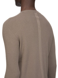 RICK OWENS SS26 TEMPLE RIBBED GEO IN DUST RIBBED KNIT THIS RIBBED GEO SWEATER IS ABOVE-HIP LENGTH WITH A SLIM FIT AND LONG SLEEVES. IT HAS A RIBBED ROUND NECK, SLEEVES AND BODY, WITH A CONTRAST FLAT SECOND PANEL ACROSS A GEOMETRIC YOKE AND SIGNATURE KNIT LINE RUNNING DOWN THE CENTER BACK SPINE THIS LIGHTWEIGHT AND CLASSIC RIBBED WOOL KNIT HAS A SOFT HANDFEEL COLOR: DUST MATERIAL:100% NEW WOOL MODEL IS 189CM TALL MODEL WEARS SIZE M