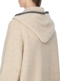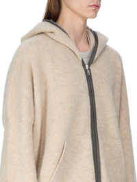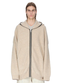 RICK OWENS FW25 CONCORDIANS GIMP HOODIE OVERSIZE IN DNA DUST ALPACA KNIT THIS GIMP HOODIE IS MID THIGH LENGTH WITH AN OVERSIZE FIT. IT HAS LONG SLEEVES WITH LOW SHOULDERS AND A DROPPED ARMHOLE, A LARGE HOOD AND TWO FRONT PATCH POCKETS. IT FEATURES IT HAS A FRONT ZIPPER CLOSURE THAT RUNS FROM THE HEM ALL THE WAY UP THROUGH THE HOOD, ALLOWING IT TO BE ZIPPED COMPLETELY CLOSED OVER THE FACE THIS A DENSE BUT LIGHT KNIT WITH A SOFT SLIGHTLY FLUFFY HAND COLOR: DNA DUST MATERIAL: 48% ALPACA + 30% NYLON + 20% WOOL + 2% ELASTANE MODEL IS 189CM TALL MODEL WEARS SIZE L