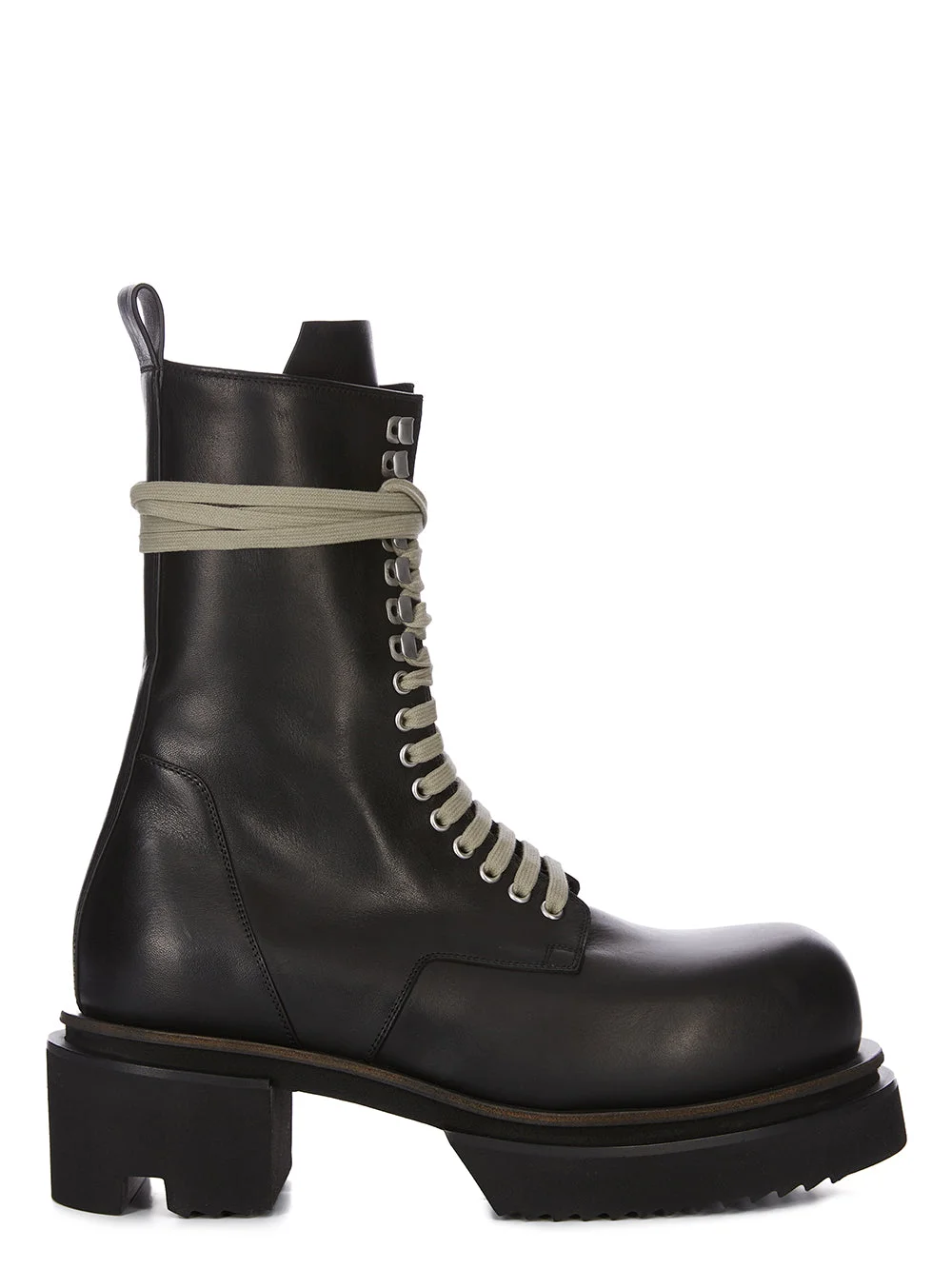 RICK OWENS SS26 TEMPLE LACEUP BOGUN IN BLACK WASHED CALF LEATHER THESE LACEUP BOGUN ARE MID-CALF HEIGHT. THEY HAVE EYELETS AND HOOKS WITH LONG LACES THAT WRAP AROUND THE ANKLE. THEY HAVE ANGLED TOPSTITCHED PANELS AND A ZIPPER ON THE INNER LEG FOR EASY FASTENING, AND A BACK PULL TAB. THEY HAVE A ROUNDED TOE AND FEATURE A BOGUN RUBBER MEGA CREEPER SOLE WITH A TOOTHED SQUARE 7CM HEEL. THIS MEDIUMWEIGHT CALF LEATHER IS VEG TANNED AND FINISHED USING NATURAL WAXES. A FINAL WASH GIVES THIS LEATHER ITS SOFTNESS AND BRINGS OUT THE NATURAL GRAIN TEXTURE OF EACH SKIN. BECAUSE THIS SKIN IS NAKED, NOT FINISHED USING ANY PIGMENTS COVERING THE SKIN, NATURAL MARKINGS AND SHADINGS ARE VISIBLE WHICH MAKES EACH SKIN AND PRODUCT UNIQUE. VEG TANNING MEANS ONLY VEGETAL AND NATURAL TANNINS WERE USED IN THE PROCESS OF TANNING AND PRESERVING THIS LEATHER. THIS TANNERY IS LWG CERTIFIED WITH A SILVER RATING. COLOR: BLACK MATERIAL:UPPER 100% CALF LEATHER LINING 100% CALF LEATHER INSOLE 100% CALF LEATHER INTERSOLE 100% E.V.A SOLE 100% E.V.A SAMPLE SIZE 44 SOLE AT TOE 4CM AT HEEL 7CM