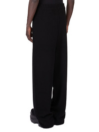 RICK OWENS FW25 CONCORDIAS TRACK IN BLACK LAS PALMAS CASHMERE KNIT THESE TRACK PANTS ARE FULL LENGTH WITH A WIDE RIB, ELASTICIZED WAISTBAND WITH DRAWSTRING. THEY HAVE A DROPPED CROTCH AND RIBBED HEMS THIS HEAVYWEIGHT CASHMERE KNIT HAS A SOFT AND WARM HANDFEEL. IT IS KNITTED BOTH IN A CLASSIC RASATO STITCH AND A WIDE RIB COLOR: BLACK MATERIAL: 100% CASHMERE MODEL IS 189CM TALL MODEL WEARS SIZE M