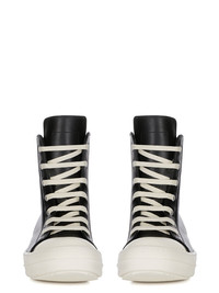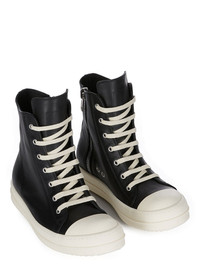 RICK OWENS FW25 CONCORDIANS SNEAKERS IN BLACK/MILK/MILK FULL GRAIN COW LEATHER THESE SNEAKERS ARE ABOVE-ANKLE HEIGHT AND FEATURE SEVEN EYELETS, LACES, A ZIPPER ON THE INSIDE ANKLE FOR EASY FASTENING, TOE CAPS AND SHARK-TOOTHED BUMPER SOLES. THIS MEDIUMWEIGHT FULL GRAIN COW LEATHER HAS A FLAT AND MATTE SURFACE FINISH AND IS SPECIFICALLY TANNED FOR SHOES WITH AN ABRASION-RESISTANT FINISH. THIS TANNERY IS LWG CERTIFIED WITH A BRONZE RATING. COLOR: BLACK/MILK/MILK MATERIAL: UPPER 100% COW LEATHER TOE 100% CALF LEATHER LINING 100% CALF LEATHER INSOLE 100% CALF LEATHER SOLE 100% THERMOPLASTIC RUBBER SOLE HEIGHT 3.5CM
