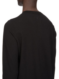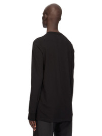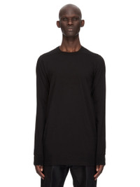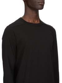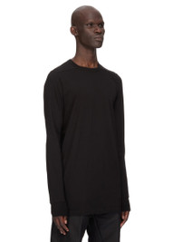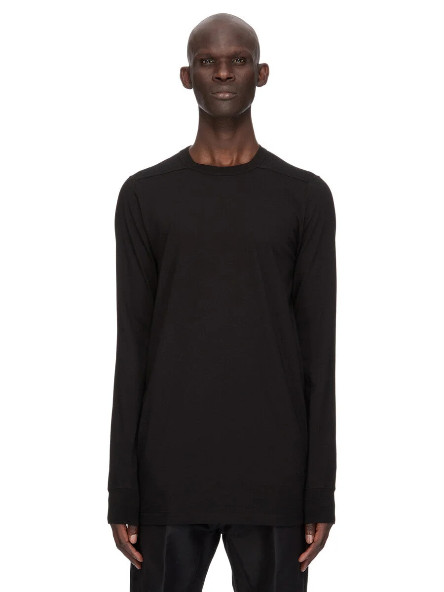 RICK OWENS SS26 TEMPLE LEVEL LS T IN BLACK CLASSIC COTTON JERSEY THIS LEVEL LS T IS BELOW-HIP LENGTH WITH LONG SLEEVES. IT HAS A RIBBED ROUND NECK AND CUFFS. IT FEATURES THE SIGNATURE LEVEL SHOULDER SEAMS AND SINGLE SEAM RUNNING DOWN THE CENTER BACK SPINE. THIS MEDIUMWEIGHT CLASSIC COTTON JERSEY IS COMPACT WITH A DRY HANDFEEL. THIS JERSEY IS MADE USING GOTS CERTIFIED ORGANIC COTTON WHICH MEANS THE NATURAL FIBER IS GROWN WITHOUT HARMFUL CHEMICALS, LEAVING OUR SOIL, AIR AND WATER CLEANER FROM CONTAMINATES. WE STRIVE TO KEEP OUR PRODUCTION AS LOCAL AS POSSIBLE. THE FULL MANUFATURING CYCLE OF THIS PRODUCT, FROM THE MATERIAL KNITTING TO SEWING AND FINISHING, WAS UNDERTAKEN CLOSE TO OUR HOME BASE IN CONCORDIA, ITALY. COLOR: BLACK MATERIAL: 100% COTTON MODEL IS 189CM TALL MODEL WEARS SIZE S