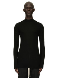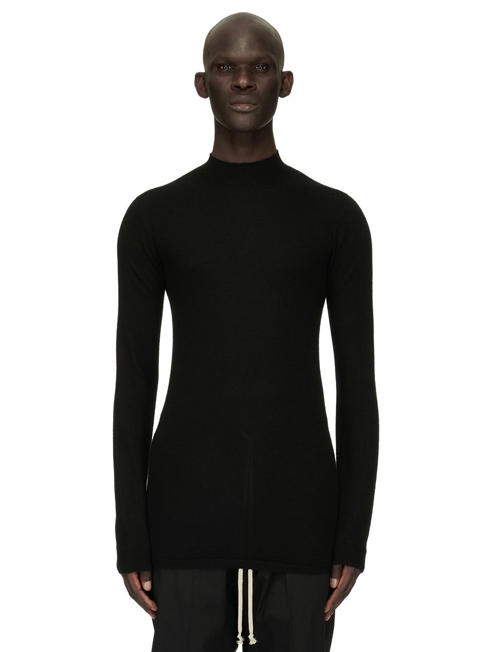 RICK OWENS SS25 HOLLYWOOD LEVEL LUPETTO IN BLACK LIGHTWEIGHT RASATO KNIT THIS LEVEL LUPETTO IS HIP LENGTH WITH LONG SLEEVES. IT HAS A SMALL FUNNEL NECK, WITH RIBBED NECK, CUFFS AND HEM. IT FEATURES THE SIGNATURE LEVEL SHOULDER SEAMS AND A KNIT LINE RUNNING DOWN THE CENTRE BACK SPINE. THIS VERSION HAS THE PROFORMA MOTIVO, WITH TWO PARALLEL LINES RUNNING HORIZONTALLY ACROSS THE CHEST, DOWN THE FRONT OF THE SLEEVES, SLOPING DIAGONALLY AT THE ELBOW INTO A SINGLE LINE TO THE CUFF THIS IS A LIGHTWEIGHT AND SOFT CLASSIC STITCH CASHMERE KNIT COLOR: BLACK MATERIAL: 100% CASHMERE MODEL IS 189CM TALL MODEL WEARS SIZE 48