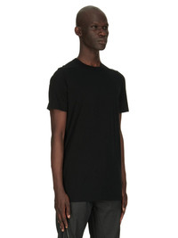 RICK OWENS FW24 PORTERVILLE LEVEL T IN BLACK CASHMERE BLEND JERSEY THIS LEVEL T IS BELOW HIP-LENGTH WITH SHORT SLEEVES AND A RIBBED ROUND CREWNECK. IT FEATURES THE SIGNATURE LEVEL SHOULDER SEAMS AND SINGLE SEAM RUNNING DOWN THE CENTRE BACK SPINE THIS LIGHTWEIGHT COTTON CASHMERE BLEND JERSEY HAS A SOFT AND WARM HANDFEEL. THIS JERSEY IS MADE USING GOTS CERTIFIED ORGANIC COTTON WHICH MEANS THE NATURAL FIBER IS GROWN WITHOUT HARMFUL CHEMICALS, LEAVING OUR SOIL, AIR AND WATER CLEANER FROM CONTAMINATES - COLOR: BLACK - MATERIAL: 90% COTTON + 10% CASHMERE - MODEL IS 189CM TALL - MODEL WEARS SIZE S