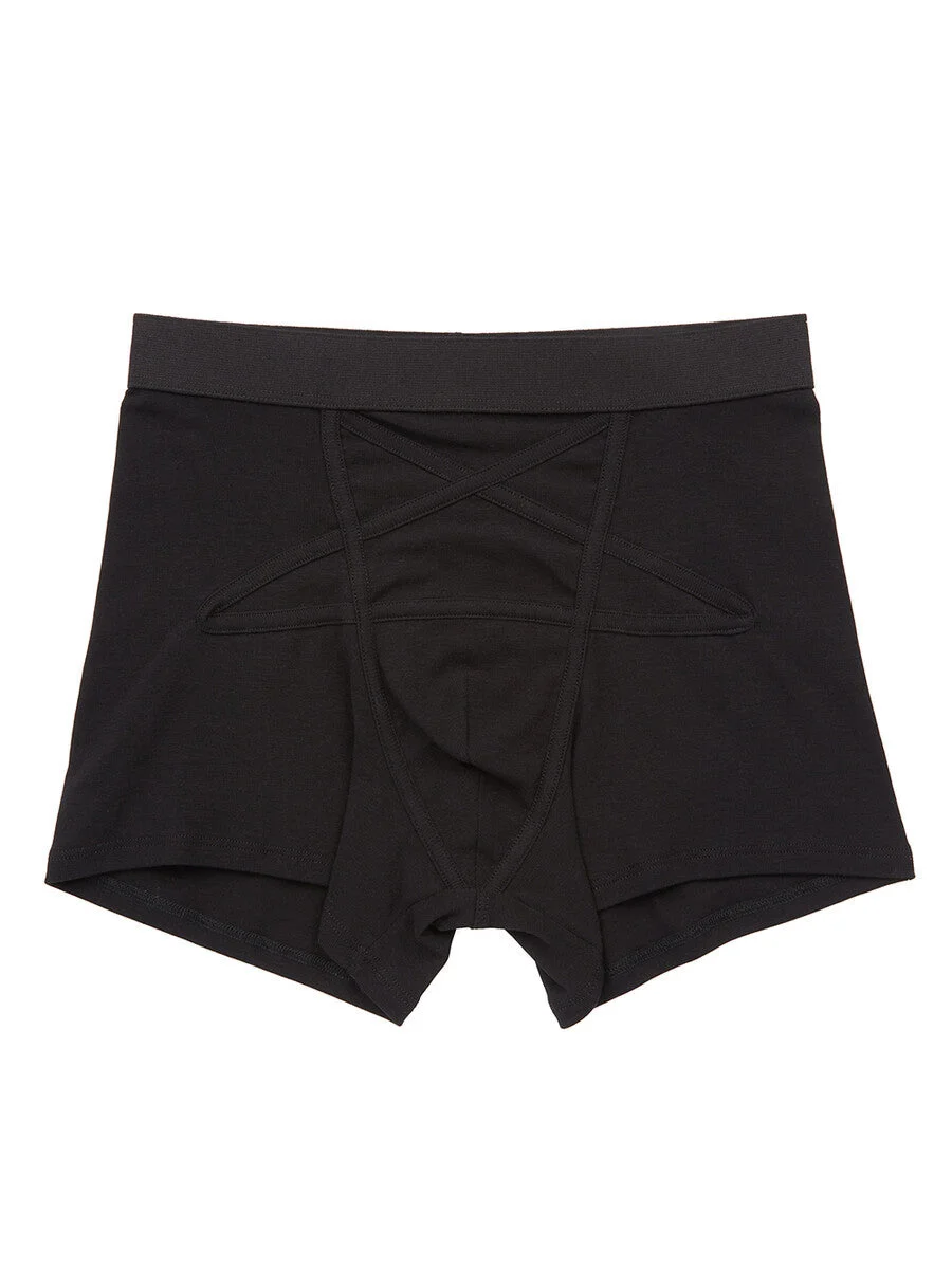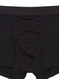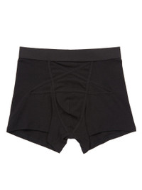 RICK OWENS SS26 TEMPLE PENTA BOXER BRIEF IN BLACK COTTON STRETCH RIB JERSEY THIS PENTA BOXER BRIEF IS MID-THIGH LENGTH, HAS AN ELASTICIZED WAISTBAND IT FEATURES A SIGNATURE PENTAGRAM PATCHWORK WITH TOPSTITCHED SEAMS ON FRONT.T HIS BOXER IS DESIGNED FOR SWIMMING, OR SPORT, AND HAS AN INTERNAL BRIEF. THIS MEDIUMWEIGHT COTTON STRETCH RIB JERSEY HAD A SOFT HANDFEEL AND A COMFORT STRETCH. THIS JERSEY IS MADE USING GOTS CERTIFIED ORGANIC COTTON WHICH MEANS THE NATURAL FIBER IS GROWN WITHOUT HARMFUL CHEMICALS, LEAVING OUR SOIL, AIR AND WATER CLEANER FROM CONTAMINATES. WE STRIVE TO KEEP OUR PRODUCTION AS LOCAL AS POSSIBLE. THE FULL MANUFACTURING CYCLE OF THIS PRODUCT, FROM THE MATERIAL KNITTING TO SEWING AND FINISHING, WAS UNDERTAKEN CLOSE TO OUR HOME BASE IN CONCORDIA, ITALY. COLOR: BLACK MATERIAL:96% COTTON + 4% ELASTANE MODEL IS 189CM TALL MODEL WEARS SIZE S