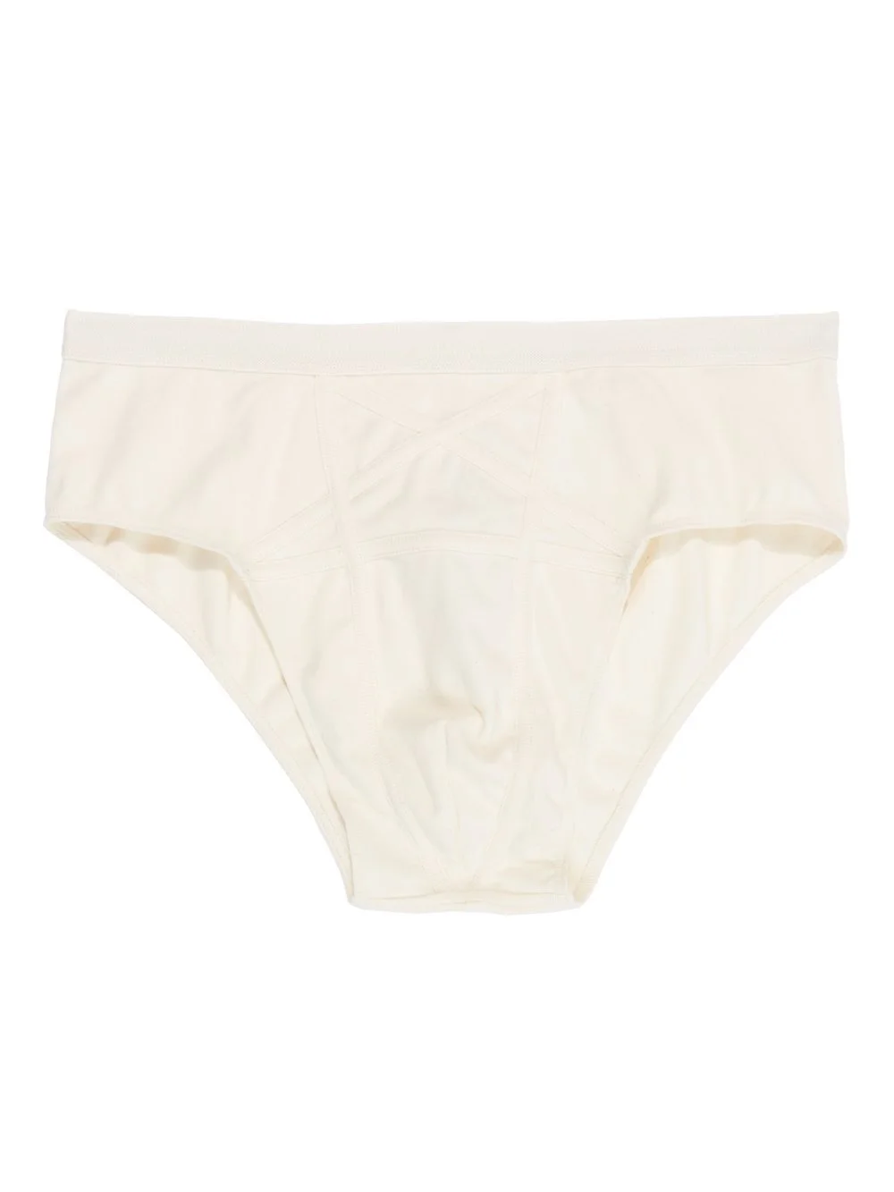 RICK OWENS FW25 CONCORDIANS PENTA BRIEF IN NATURAL COTTON STRETCH RIB JERSEY THESE PENTA BRIEF ARE SKIN TIGHT WITH AN ELASTICIZED WAISTBAND. THEY FEATURE A SIGNATURE PENTAGRAM PATCHWORK WITH TOPSTITCHED SEAMS ON FRONT THIS MEDIUMWEIGHT COTTON STRETCH RIB JERSEY HAD A SOFT HANDFEEL AND A COMFORT STRETCH THIS JERSEY IS MADE USING GOTS CERTIFIED ORGANIC COTTON WHICH MEANS THE NATURAL FIBER IS GROWN WITHOUT HARMFUL CHEMICALS, LEAVING OUR SOIL, AIR AND WATER CLEANER FROM CONTAMINATES WE STRIVE TO KEEP OUR PRODUCTION AS LOCAL AS POSSIBLE. THE FULL MANUFACTURING CYCLE OF THIS PRODUCT, FROM THE MATERIAL KNITTING TO SEWING AND FINISHING, WAS UNDERTAKEN CLOSE TO OUR HOME BASE IN CONCORDIA, ITALY COLOR: NATURAL MATERIAL: 96% COTTON + 4% ELASTANE MODEL IS 189CM TALL MODEL WEARS SIZE S