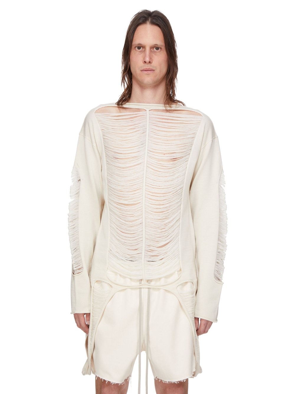RICK OWENS SS25 HOLLYWOOD RUNWAY LS TOP IN DINGE SHREDDED MERINO KNIT THIS LS TOP IS HIP LENGTH AT FRONT, WITH SIDE LOOPS THAT HANG DOWN TO BELOW HIP LENGTH. THIS LONG SLEEVE TOP FEATURES OUR SHREDDED MERINO KNIT, HAS A SLIGHT BOAT NECK, HAS A CENTRE FRONT LINE AND IS BODY REVEALING ON FRONT, SLEEVES AND SIDES. IT HAS A WIDE CHANNEL DOWN THE CENTRE BACK THIS MEDIUMWEIGHT WOOL KNIT HAS A SOFT AND FUZZY HANDFEEL. IT IS KNITTED IN AN OPEN RIB PATTERN THAT VARIES THROUGHOUT THE GARMENT. COLOR: DINGE MATERIAL: 100% NEW WOOL MODEL IS 189CM TALL MODEL WEARS SIZE M