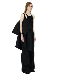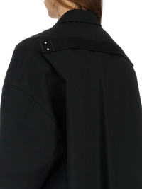 RICK OWENS SS24 LIDO MAGNUM TOMMY SHIRT IN BLACK HEAVY COTTON POPLIN THIS MAGNUM TOMMY SHIRT IS BELOW HIP LENGTH WITH AN OVERSIZED FIT, WIDE SHOULDERS AND A DROPPED ARMHOLE WITH ELBOW LENGTH SLEEVES. IT HAS A CENTRE FRONT OPENING WITH CONCEALED BUTTON CLOSURES, AND A CLASSIC COLLAR, TWO SQUARE CHEST POCKETS WITH BEVELED FLAPS AND A HEMLINE WITH BEVELED SIDE SPLITS. IT FEATURES SIGNATURE LEVEL SHOULDER SEAMS AND A COTTON WEBBING STRAP WITH RIVET DETAIL ON THE BACK YOKE. IT IS UNLINED AND HAS TWO INTERNAL ZIPPERED POCKETS THIS MEDIUMWEIGHT COTTON POPLIN HAS A CRISP HANDFEEL AND WASHED FINISH THIS FABRIC IS MADE USING GOTS CERTIFIED ORGANIC COTTON WHICH MEANS THE NATURAL FIBER IS GROWN WITHOUT HARMFUL CHEMICALS, LEAVING OUR SOIL, AIR AND WATER CLEANER FROM CONTAMINATES - COLOR: BLACK - MATERIAL: 97% COTTON + 3% ELASTANE - BUTTONS 100% BUFFALO HORN - MODEL IS 189CM TALL - MODEL WEARS SIZE 48