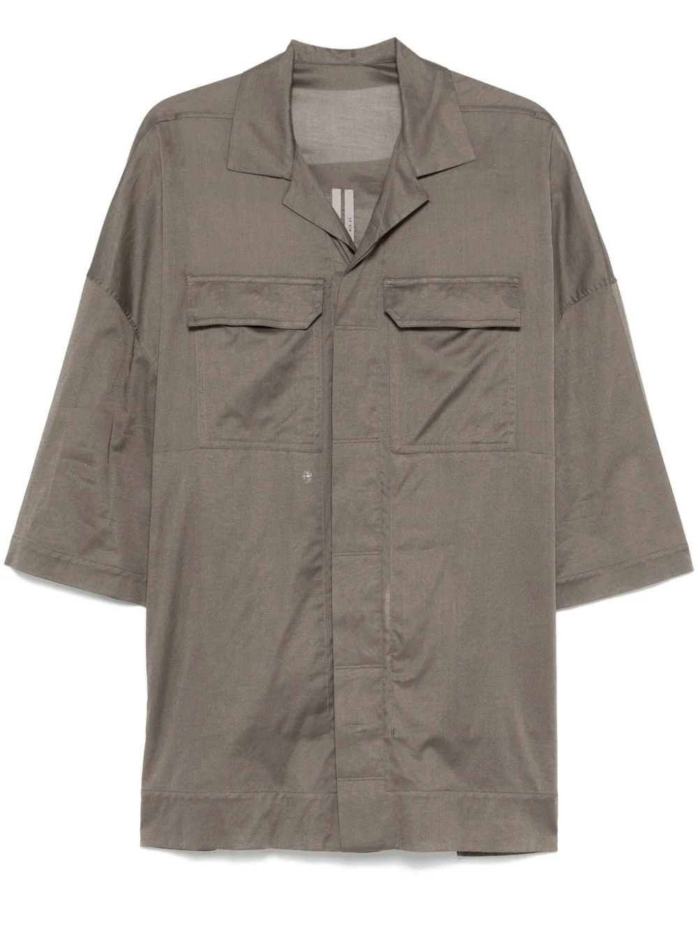 Magnum Tommy shirt Highlights - Taupe grey - Concealed front button fastening - Two chest flap pockets - Camp collar - Short sleeves Made in Italy Composition Cotton 100%, Buffalo Horn 100% SIZE & FIT Model measurements Height 6 ft 2 in(1.87 m) Bust/Chest 38.18 in(97 cm) Hips 36.61 in(93 cm) Waist 29.13 in(74 cm) FittingInformation Designed for an oversized fit, offering additional room throughout Made from a lightweight non-stretch fabric